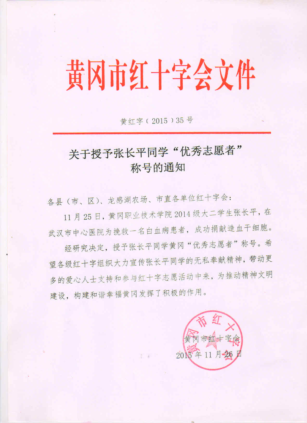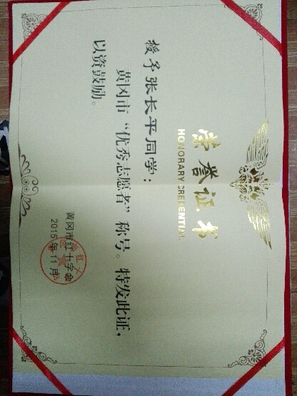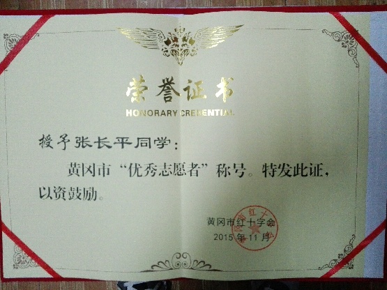 黄冈市红十字会授予张长平同学“优秀志愿者”称号